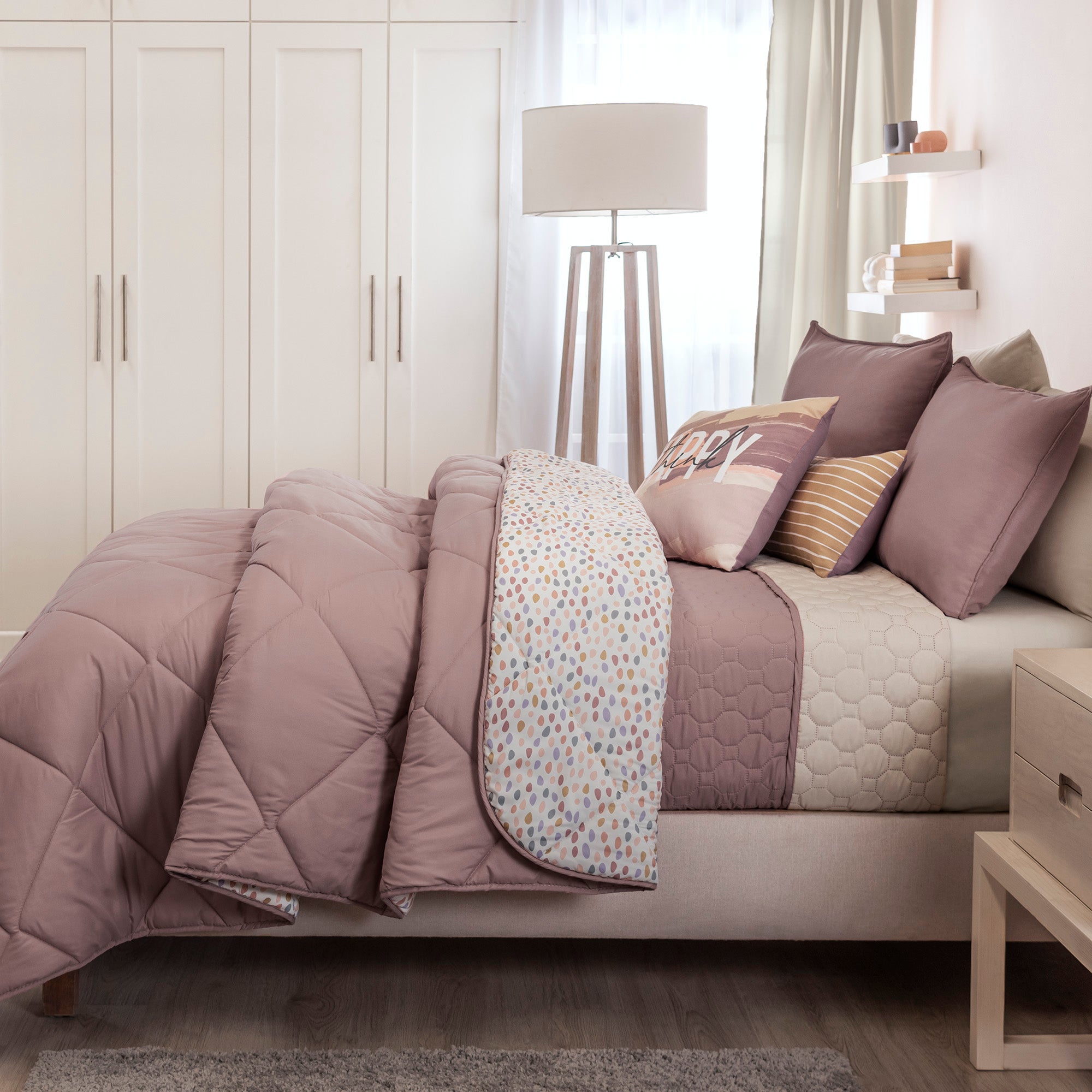 Juego de edredón doble vista. Suave por su textura viasoft. Incluye cubrecama, fundas decorativas y 2 cojines.