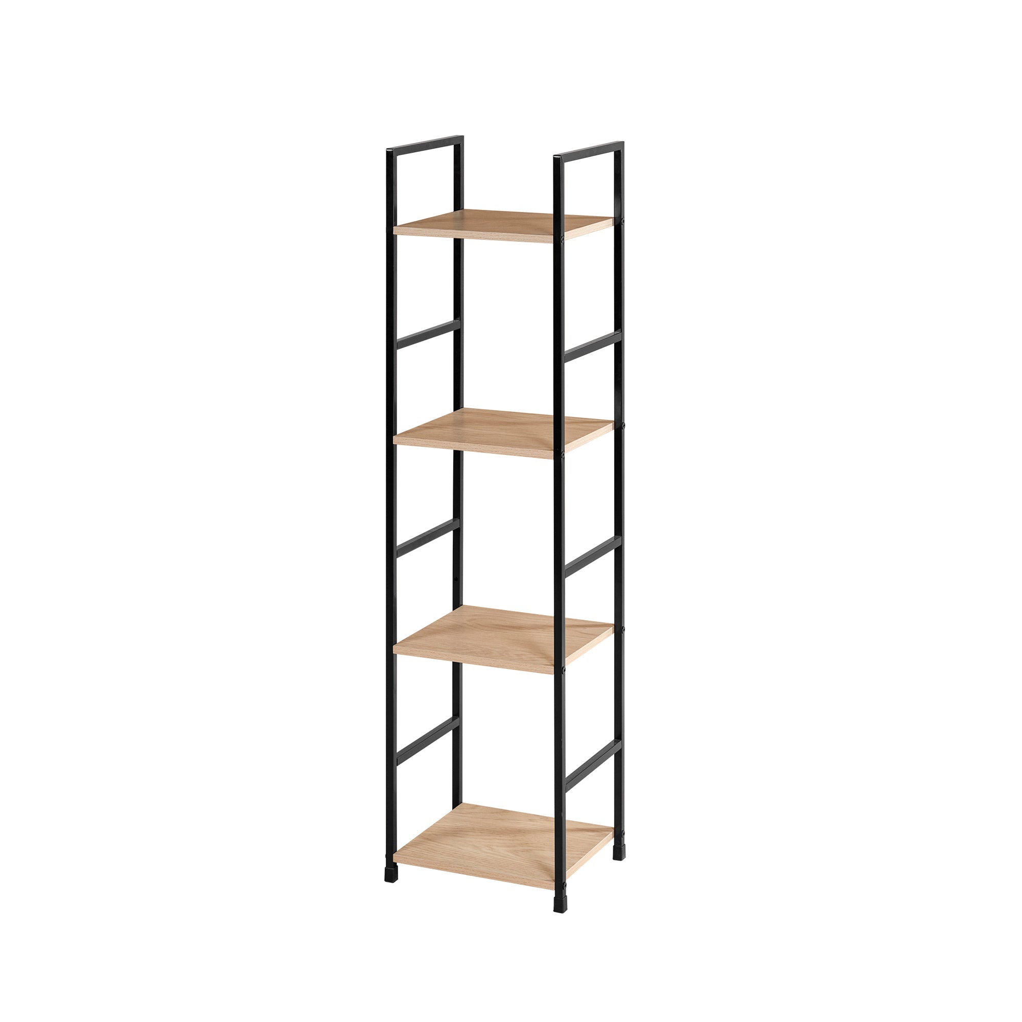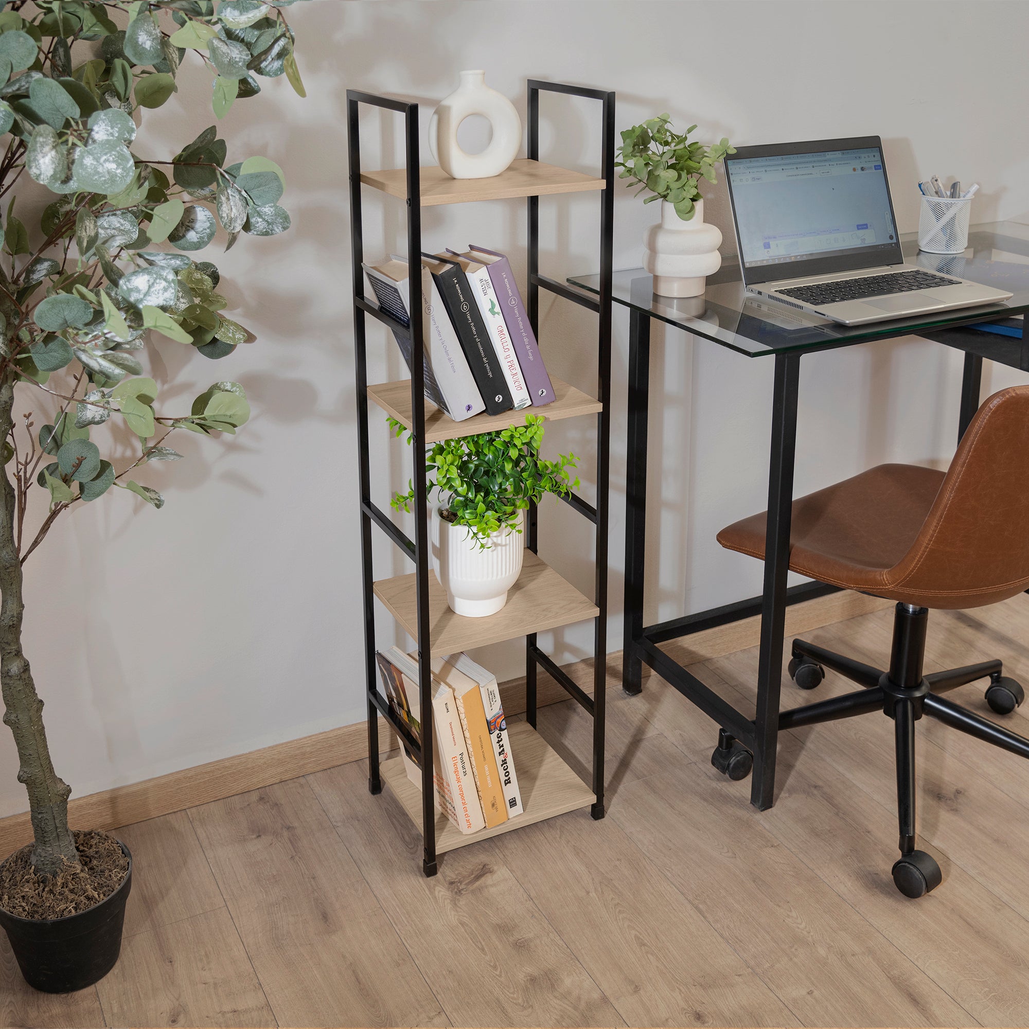 Librero de estilo industrial en color roble con estructura metálica, aportando un aire de modernidad y simplicidad